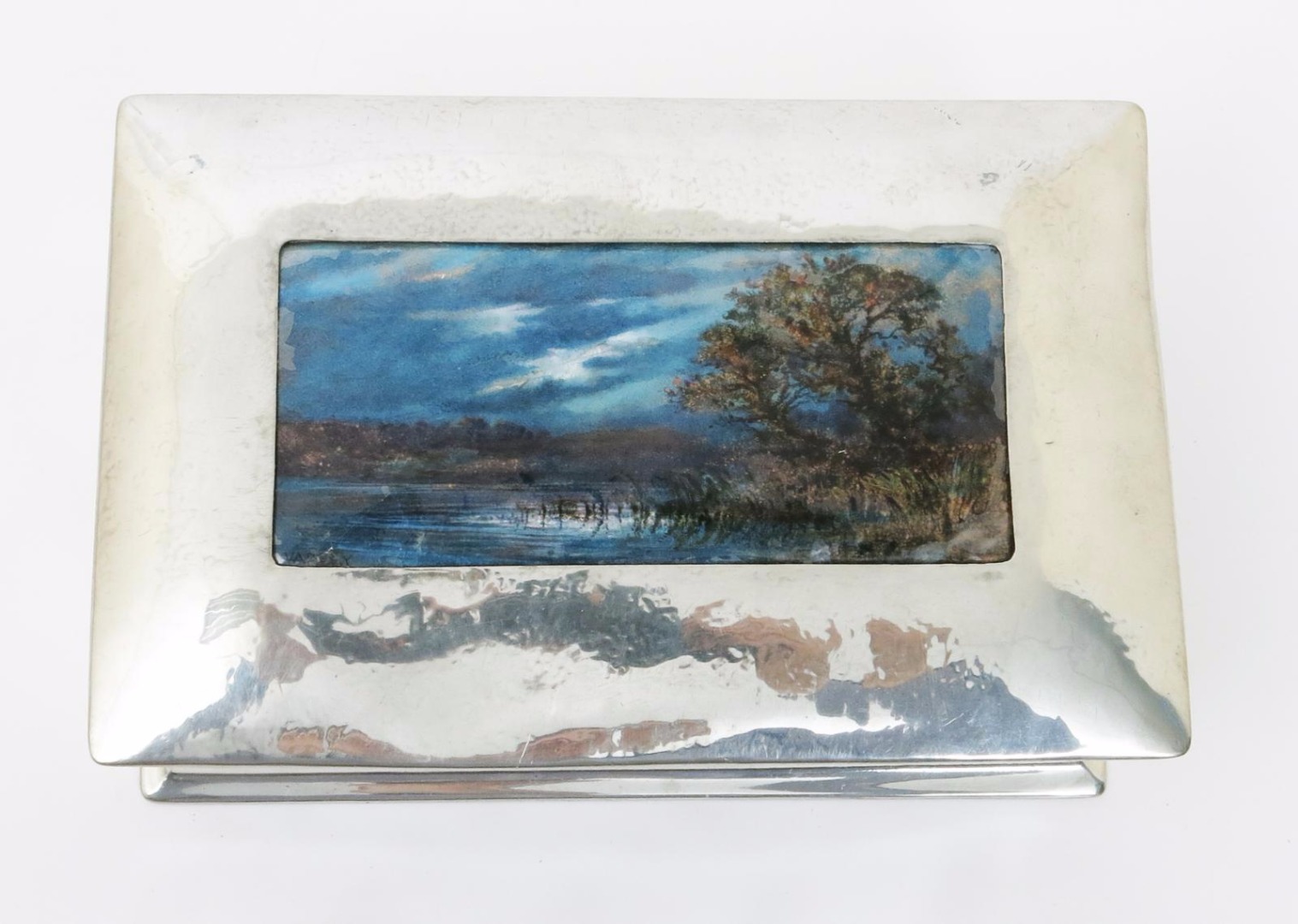 A Liberty & Co English Pewter and enamel jewellery box, rectangular form with cast petal motif, the hinged cover set with rectangular lakeside enamel by Charles Fleetwood Varley, the interior and fitted tray lined with green silk stamped marks, enamel signed Varley 21 x 13.5cm.