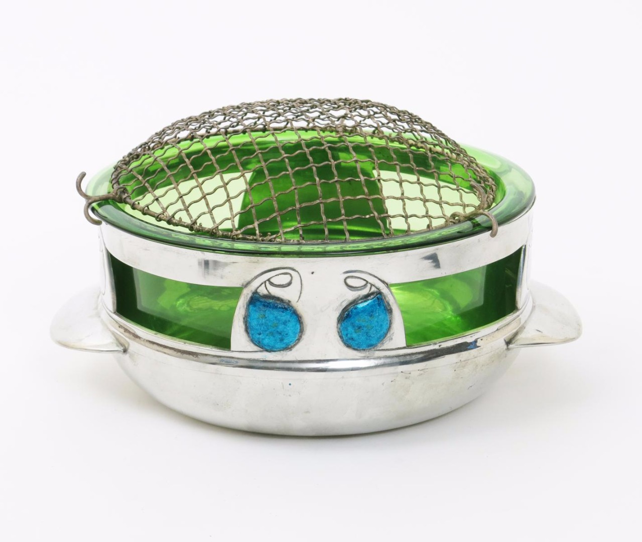 A Liberty & Co Tudric Pewter and enamel rose bowl, glass liner and original wire rose designed by Archibald Knox, model no. 0320, with twin-fin handles, cast in low relief with whiplash foliage panels, enamelled blue, with green glass liner, stamped marks, 23cm. wide