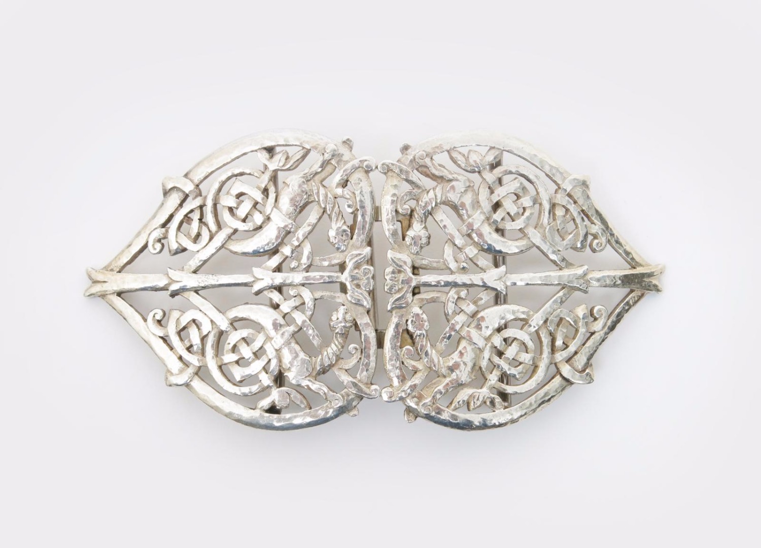A Liberty & Co silver belt buckle, model no.0198, in the manner of Mary Seton Watts, the pierced and cast design decorated with creatures entwined in Celtic knot motif, stamped marks, Birmingham 1896 11cm. wide