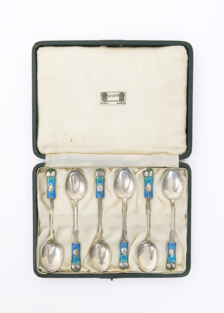 A set of six Liberty & Co silver and enamel teaspoons designed by Archibald Knox