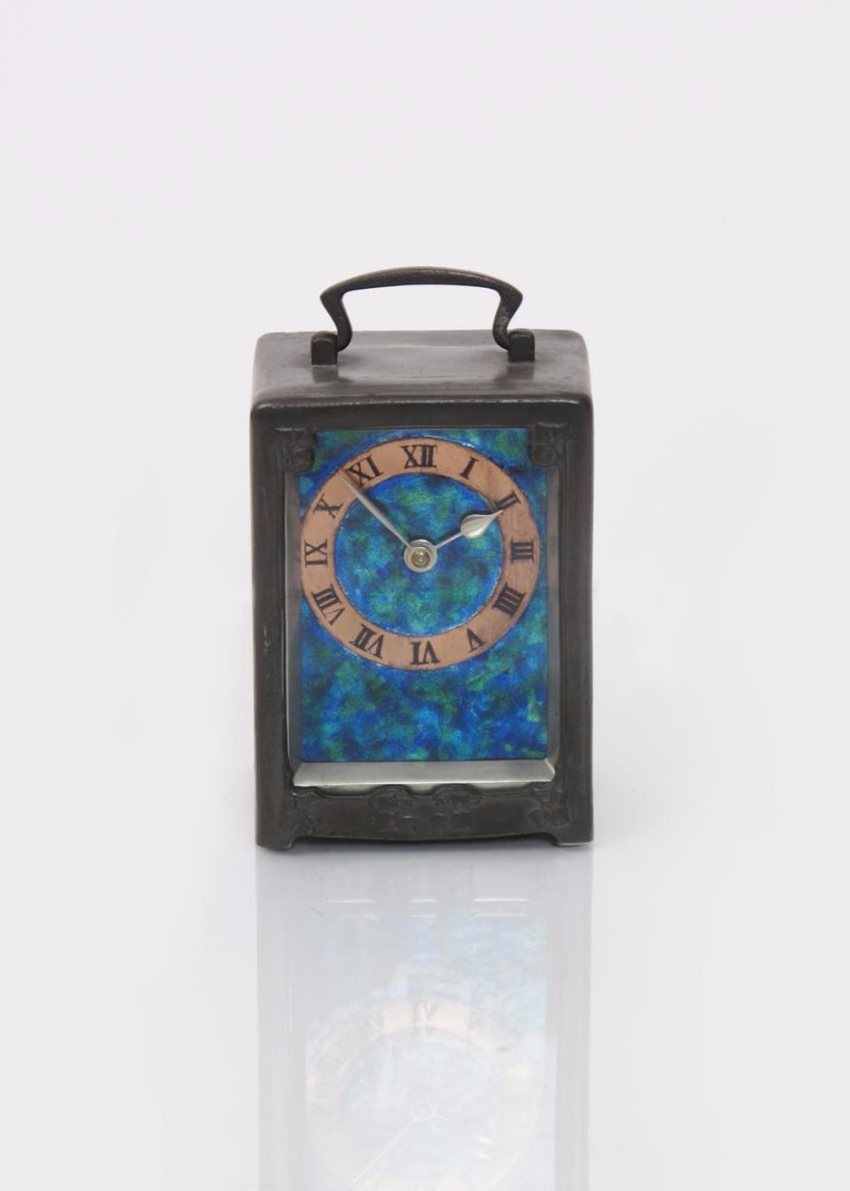A Liberty & Co English Pewter clock designed by Archibald Knox, model no.0721, rectangular form cast in low relief with stylised ivy panels, the rectangular face enamelled green and blue, with circular dial with Roman numerals, stamped marks, 12cm. high