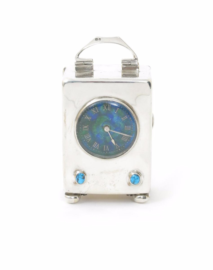 A Liberty & Co Cymric silver, enamel and turquoise clock, rectangular form on ball feet, with hinged back and handle, set with two turquoise stones, the circular diam enamelled blue and green, Roman numerals, Birmingham 1901, 8cm. high