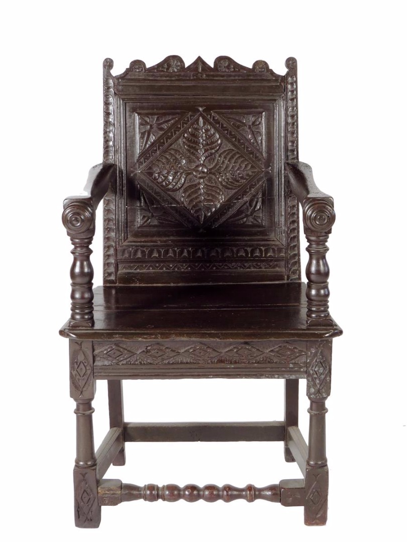 An oak open armchair, the panelled back carved with leaves and leaf spandrels above a solid seat and a carved lozenge frieze, on turned stretchered supports, 17th century and later.