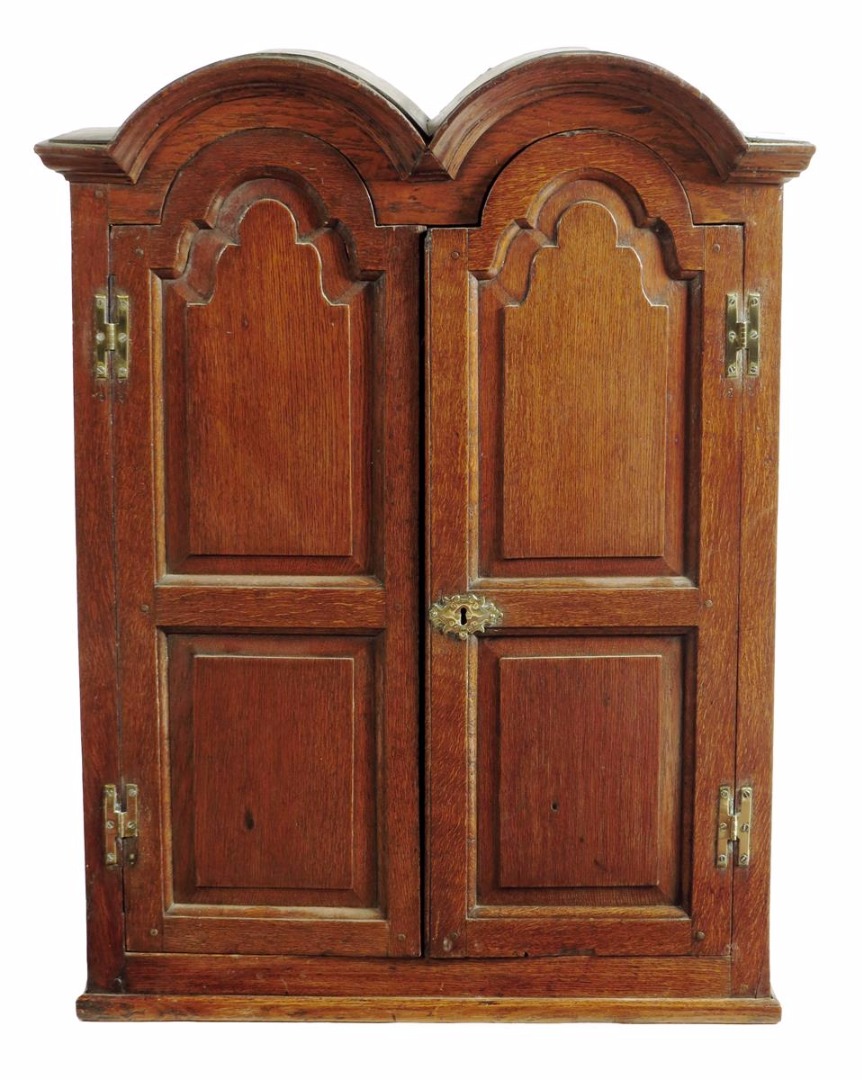 A mid 18th century oak cupboard, the double domed top above a pair of fielded panel doors enclosing a later painted interior with four shelves, 105.7cm high, 82cm wide, 33.5cm deep.
