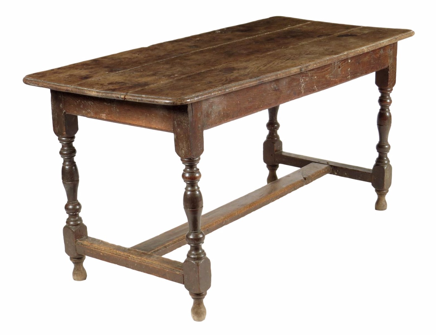 An early 18th century oak refectory table, the triple boarded top on turned legs united by an 'H' stretcher, 72.3cm high, 68.5cm wide, 144cm long.