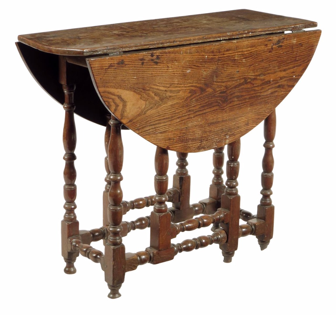 A Queen Anne elm gateleg table, the oval drop-leaf top above slender baluster and block legs united by peripheral stretchers, 71.3cm high, 87.5 x 92.5cm (open).