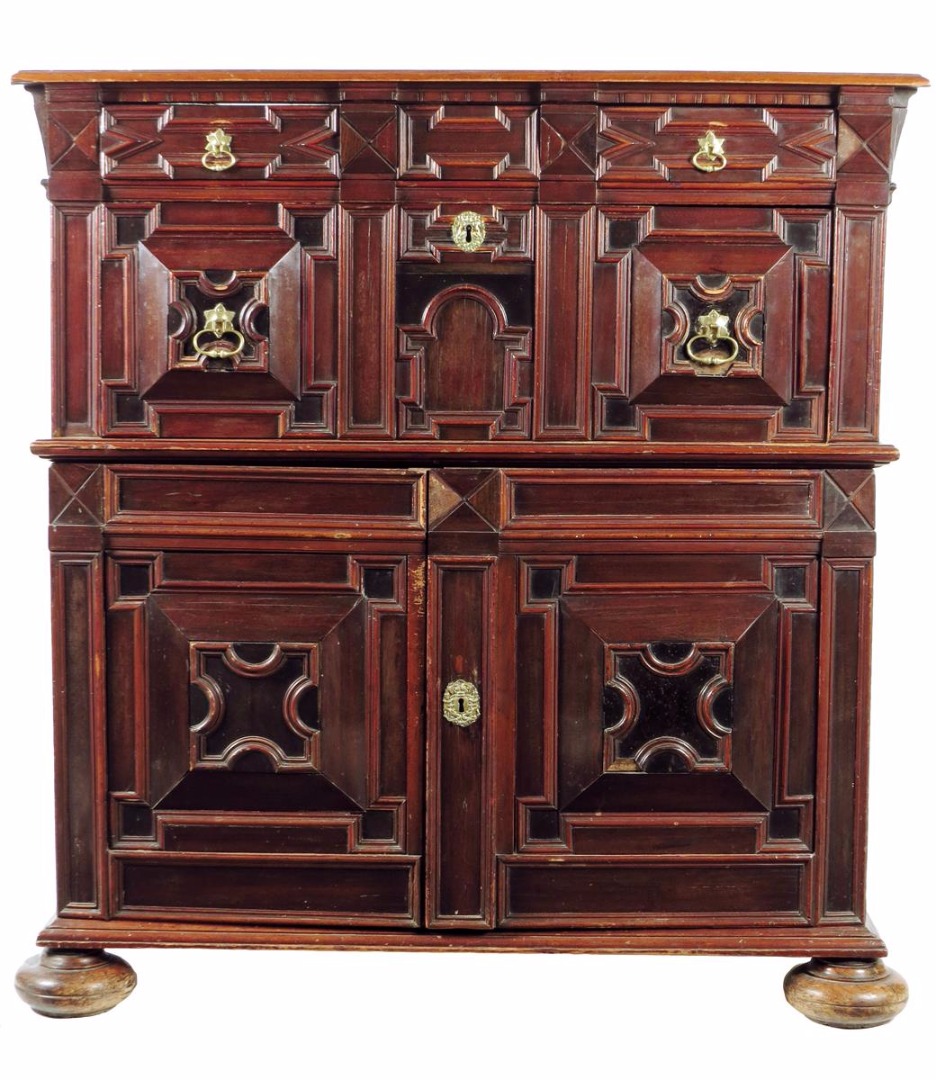 A Charles II cedar and walnut enclosed chest, in two halves, with a shallow and deep drawer, above a pair of hinged doors enclosing three oak drawers, with geometric panelled fronts with some ebony veneers on flattened bun feet, with panelled sides, 123.7cm high, 119cm wide, 63cm deep.