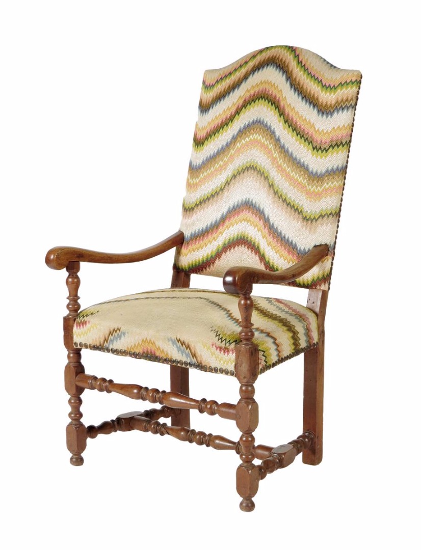 An 18th century walnut open armchair, the arched padded back and seat covered in Bargello style fabric, with turned baluster and block legs united by stretchers.