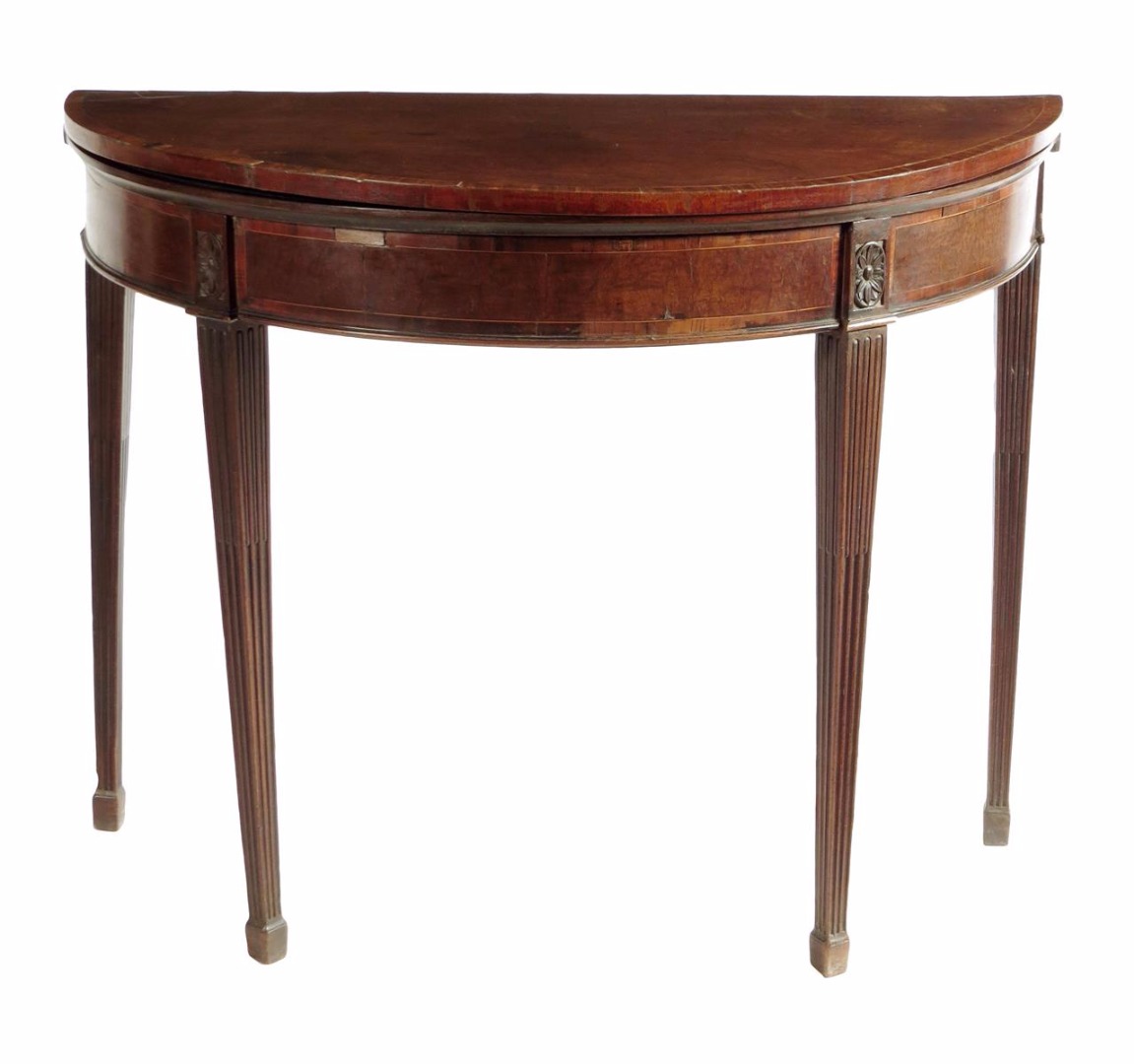 A George III mahogany demi-lune card table, with tulipwood crossbanding, the fold-over top on twin gate supports, with carved paterae above square tapering stop fluted legs and spade feet, 71.7cm high, 91.3cm wide, 44.5cm deep.