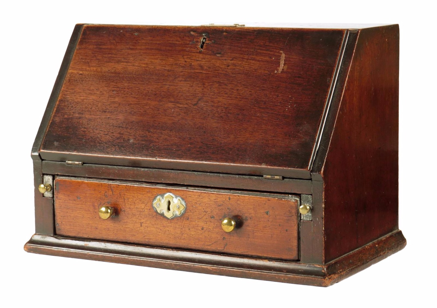 A miniature mahogany table top bureau, the interior with pigeon holes and three drawers, above a long drawer, 23.8cm high, 36.1cm wide, 20cm deep.
