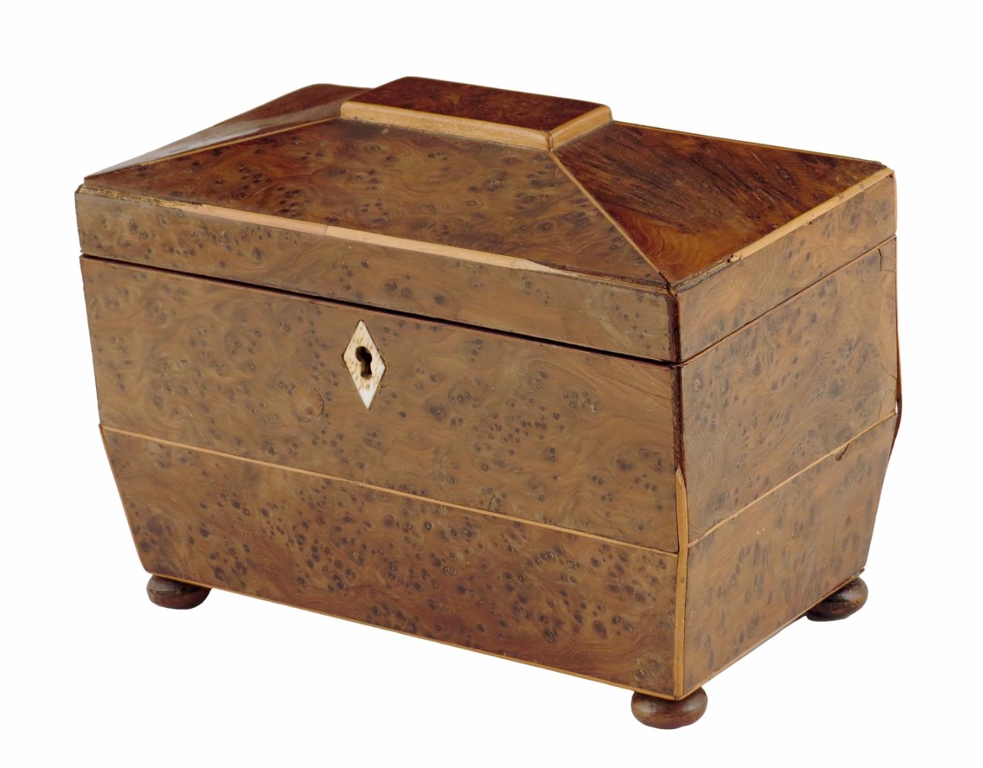 A Regency burr yew tea caddy, of sarcophagus shape, inlaid with boxwood stringing, the interior with twin lidded compartments, with a bone escutcheon and disc feet, 16cm high, 20.5cm wide.