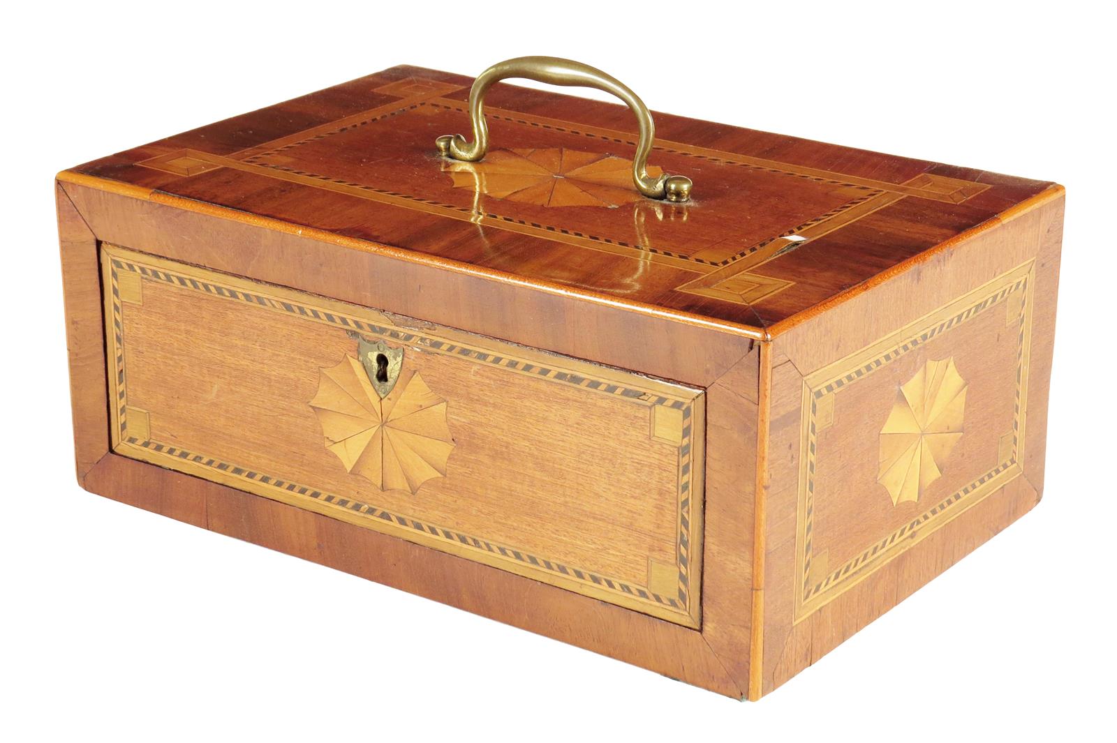 A George III mahogany and marquetry box, inlaid with stringing and banding and with fan paterae, the top with a brass swing handle above a drawer, with a lift-out plush lining, 12.7cm high, 28.9cm wide.