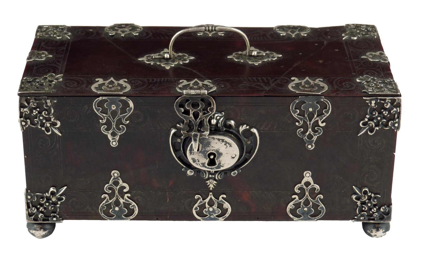 λ An 18th century continental tortoiseshell casket, with engraved borders and with cut steel strapwork mounts, the hinged lid with a swing handle above a bat's wing key escutcheon and with side ring handles on ball feet, 9.8cm high, 21.3cm wide.