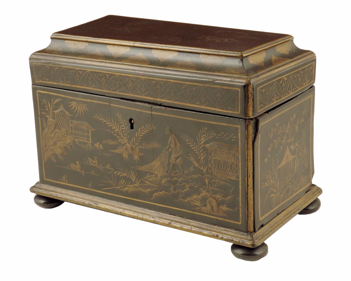 A black japanned tea caddy, decorated in gilt with part raised decoration with chinoiserie scenes, the interior with three divisions, the right side with a sliding front revealing a secret base drawer on disc feet, containing a Victorian silver caddy spoon, 18th century and later, 17.6cm high, 25.4cm wide.