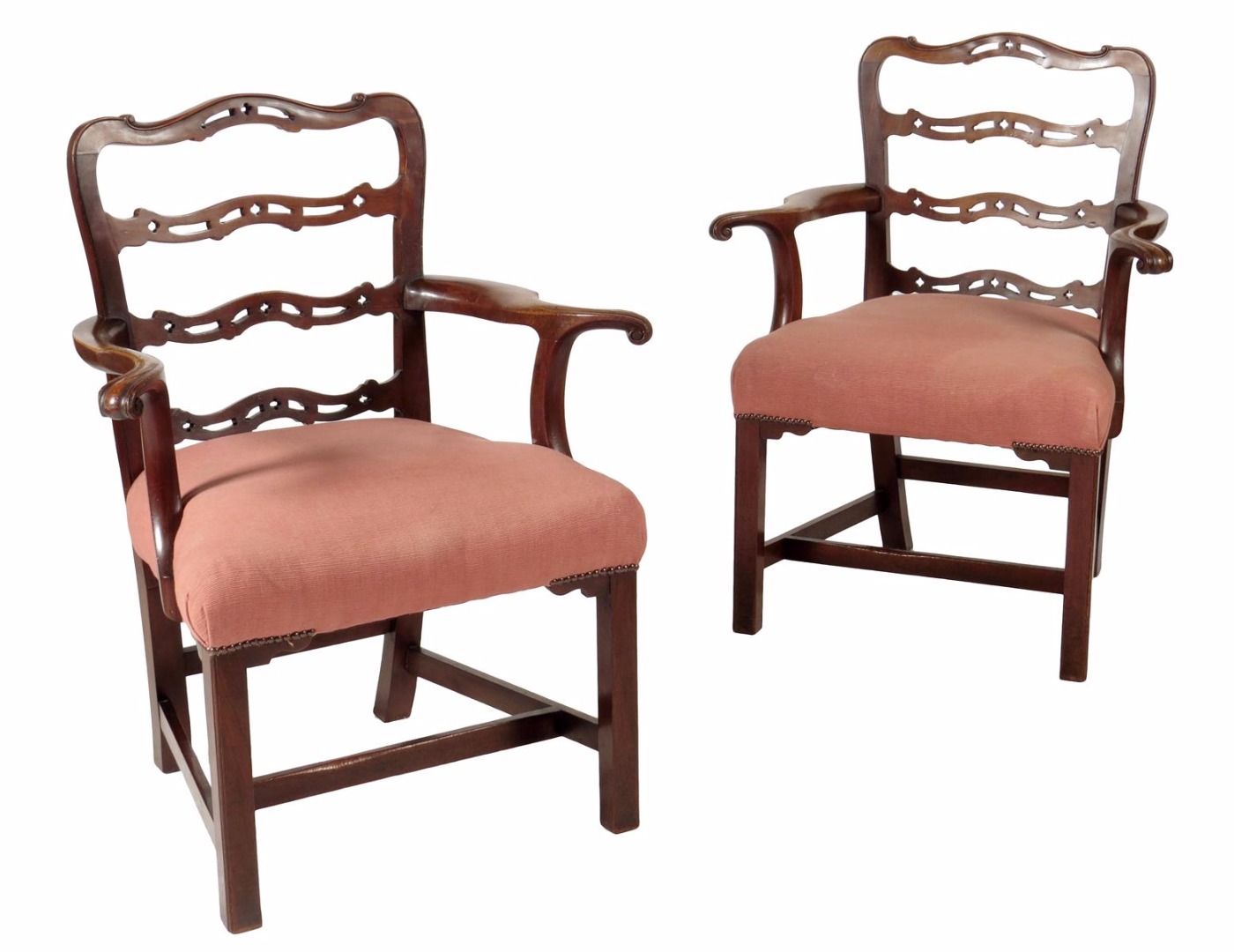 A pair of 19th century mahogany open armchairs, each with a pierced serpentine ladder back, above a pair of out-scrolling arms, with a stuffed-over seat on stretchered supports. (2)