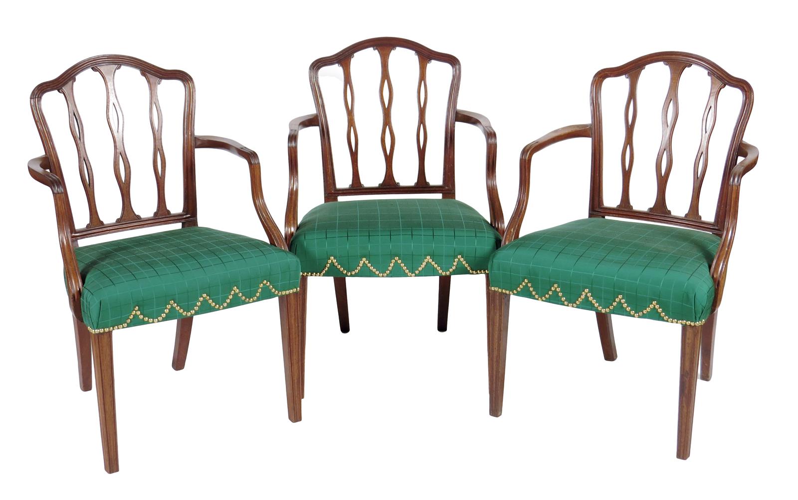 Three George III mahogany open armchairs, each with a triple pierced vertical splat back above a stuffed-over seat on moulded front legs, together with a pair of ebonised side chairs with matching green fabric seats. (5)