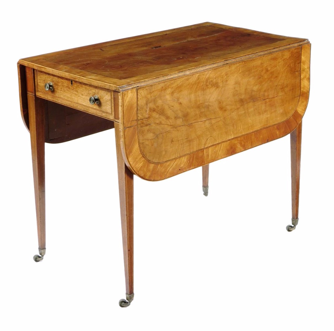 A George III mahogany Pembroke table, the drop-leaf top crossbanded in satinwood above a frieze drawer, the reverse with a false front on brass caps and castors, 70.7cm high, 86 x 180.7cm (open).