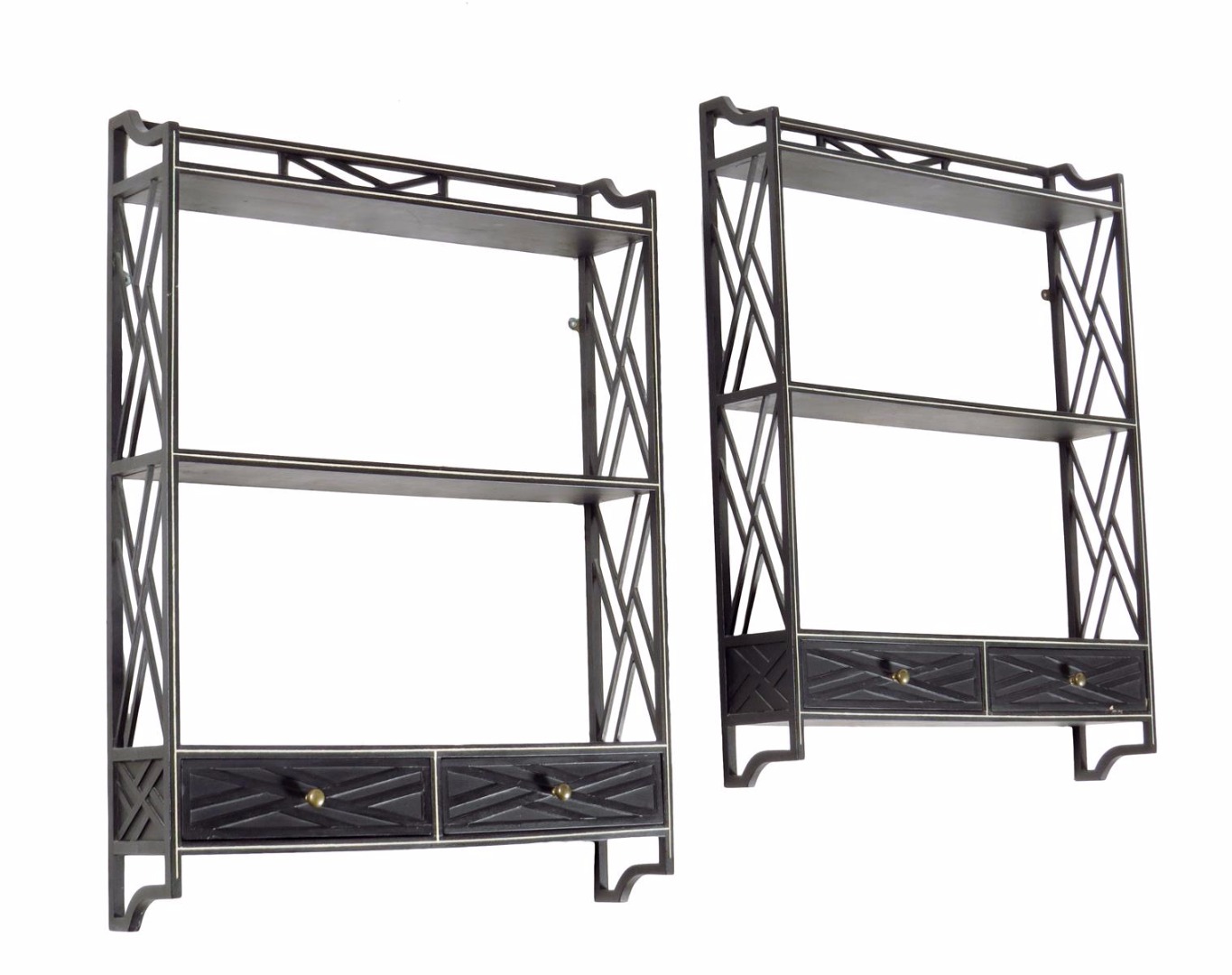 A pair of ebonised hanging wall shelves in George III style, with fretwork decoration, each fitted with a pair of drawers, modern, 77cm high, 57cm wide, 12.5cm deep. (2)