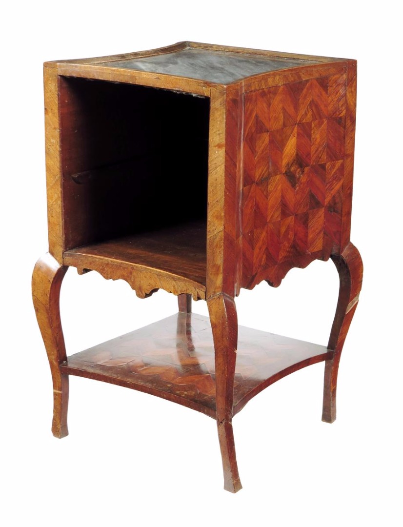 A 19th century continental walnut bedside table, of concave form with a grey marble top, the side and undertier with kingwood parquetry panels, on cabriole legs, 77cm high, 49cm wide, 47.6cm deep.