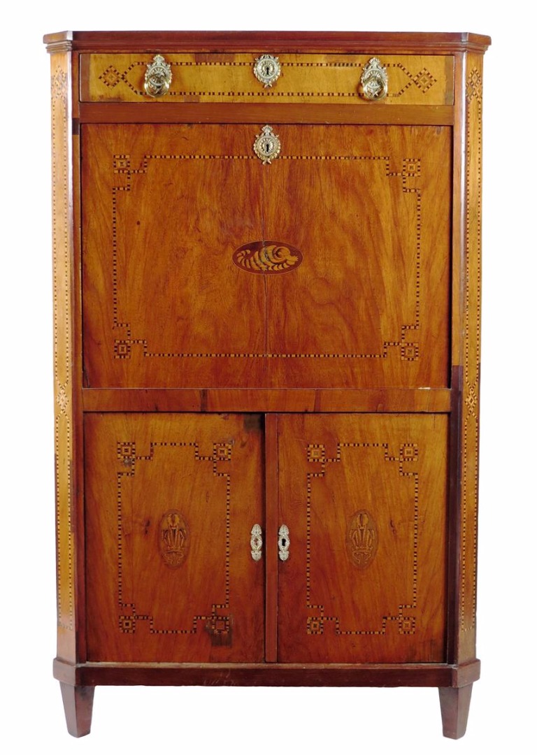 A 19th century Dutch walnut secrétaire à abattant, inlaid with chequer stringing and marquetry Prince of Wales plumes and a conch shell, with a frieze drawer above a fall front enclosing a fitted interior with pigeon holes and drawers with a central revolving compartment inlaid with a cross and two further drawers, with a leather writing surface, the base with a cupboard, 151.5cm high, 94cm wide, 47.8cm deep.