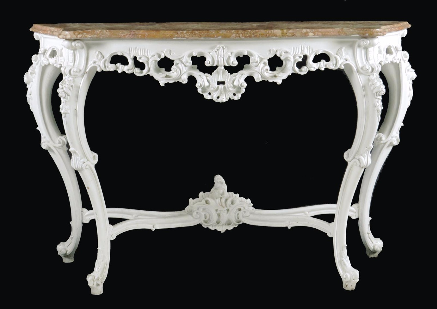 A white painted rococo style wall mirror, the shaped plate within a 'C' scroll and rocaille carved frame together with a matching console table, with a pink brèche marble top, the mirror: 156.5 x 121cm, the table: 88cm high, 136cm wide, 36cm deep. (2)