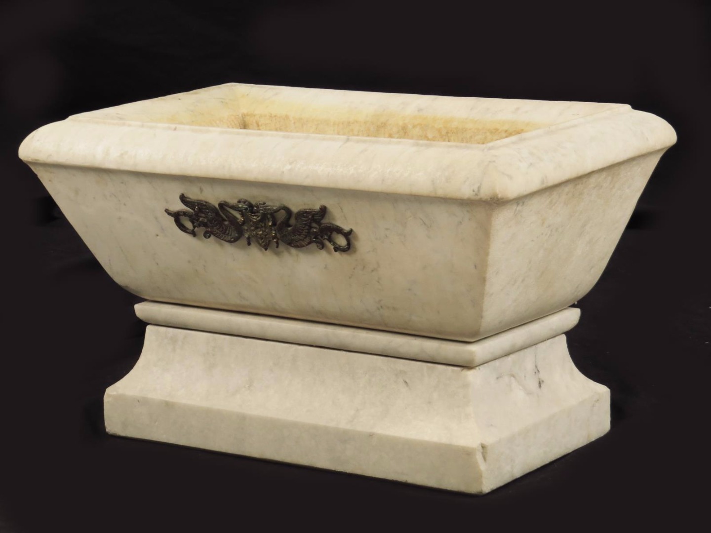 A 19th century French carved marble cistern, with a pair of bronze mounts depicting a pair of swans holding a draped standard, 24cm high, 41cm wide, 25.4cm deep.