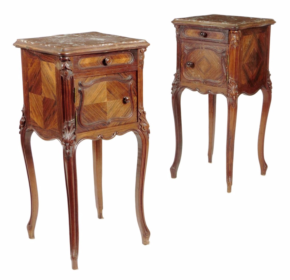 λ A pair of late 19th century French rosewood bedside cupboards, each with a red marble top, one damaged, above a drawer and a cupboard with a marble lining, on carved cabriole legs, 83.5cm high, 40cm wide, 40cm deep. (2)