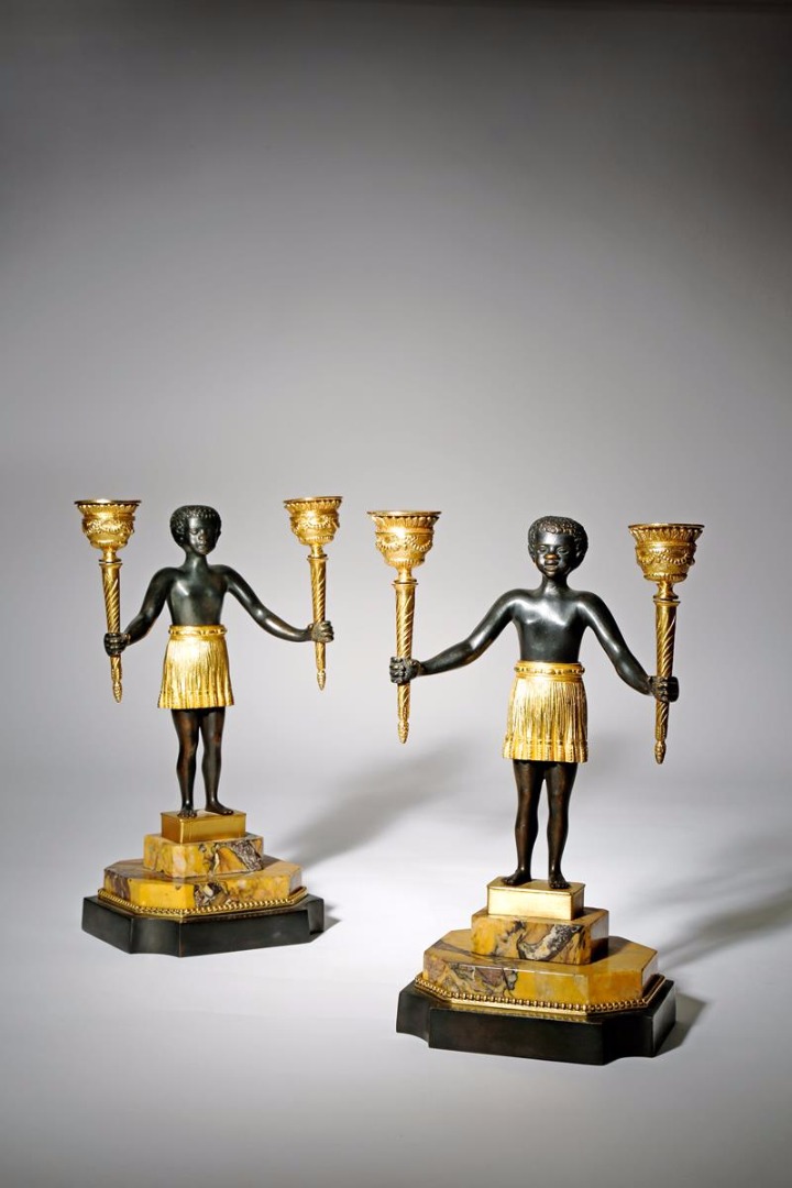 A pair of French gilt and patinated bronze candlesticks, each in the form of a standing Nubian boy holding a pair of torches on a Siena marble stepped plinth base, early 19th century and later, 28.2cm high, 17.5cm wide. (2)