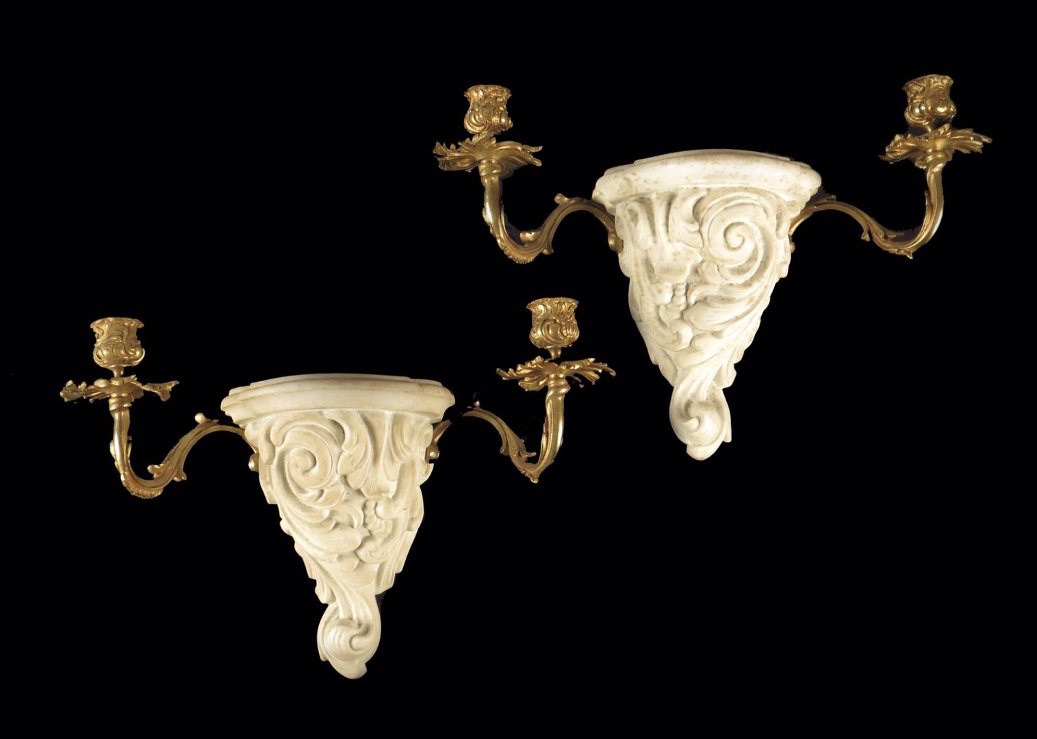 A pair of continental biscuit porcelain and gilt metal wall lights