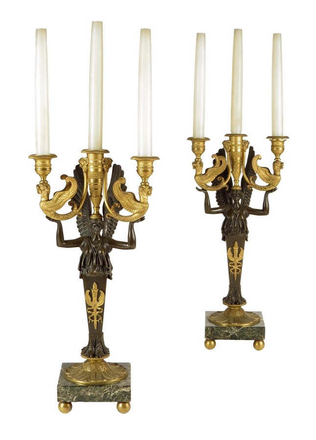 A pair of French gilt and patinated bronze candelabra in Empire style