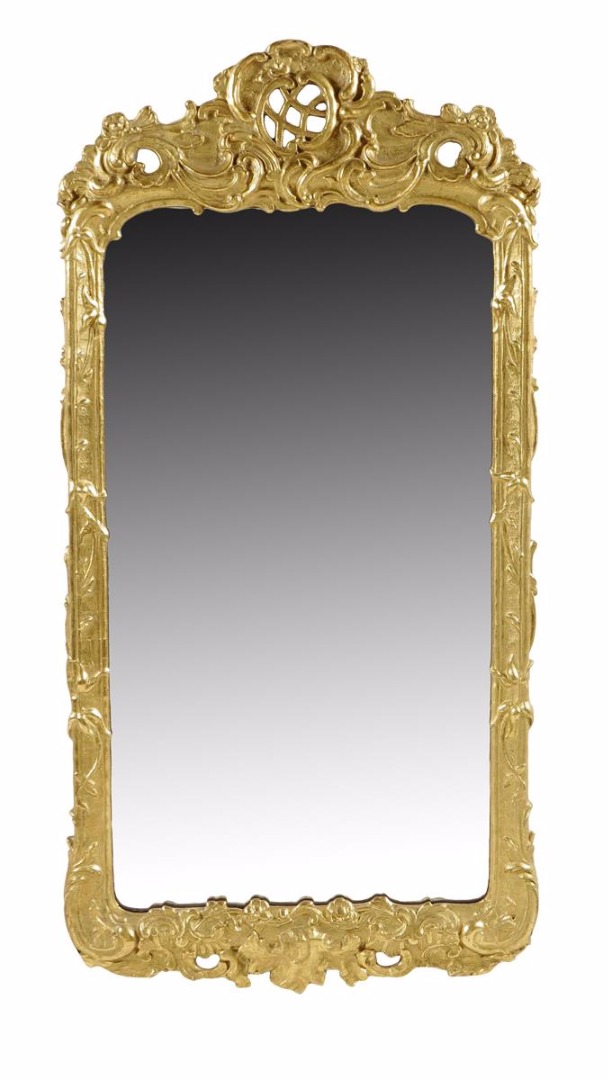 An 18th century and later giltwood and gesso pier mirror, the later plate in a rococo style frame carved with leaves and scrolls, re-gilt, 105 x 52.5cm.