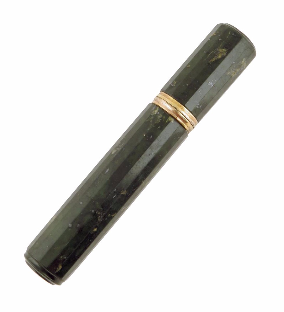 An 18th century verde di prato and gilt copper mounted bodkin case, Italian or French, with a faceted body, 11cm long.