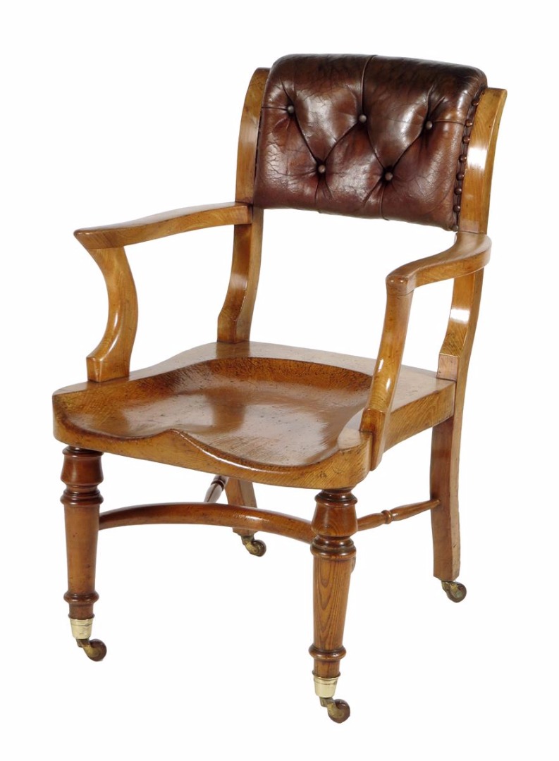 A Victorian elm desk chair, with a leather button upholstered back and a solid seat, on turned front legs united by a crinoline stretcher.