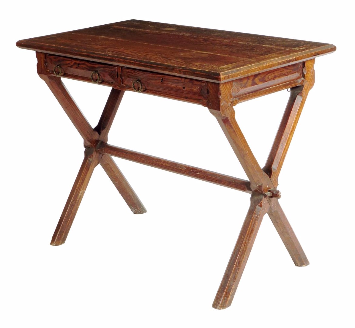 A Victorian pitch pine Gothic revival side table, the boarded top above twin frieze drawers with rope twist brass ring handles, on chamfered 'X' shape supports united by a stretcher, 74cm high, 91.3cm wide, 55.3cm deep.