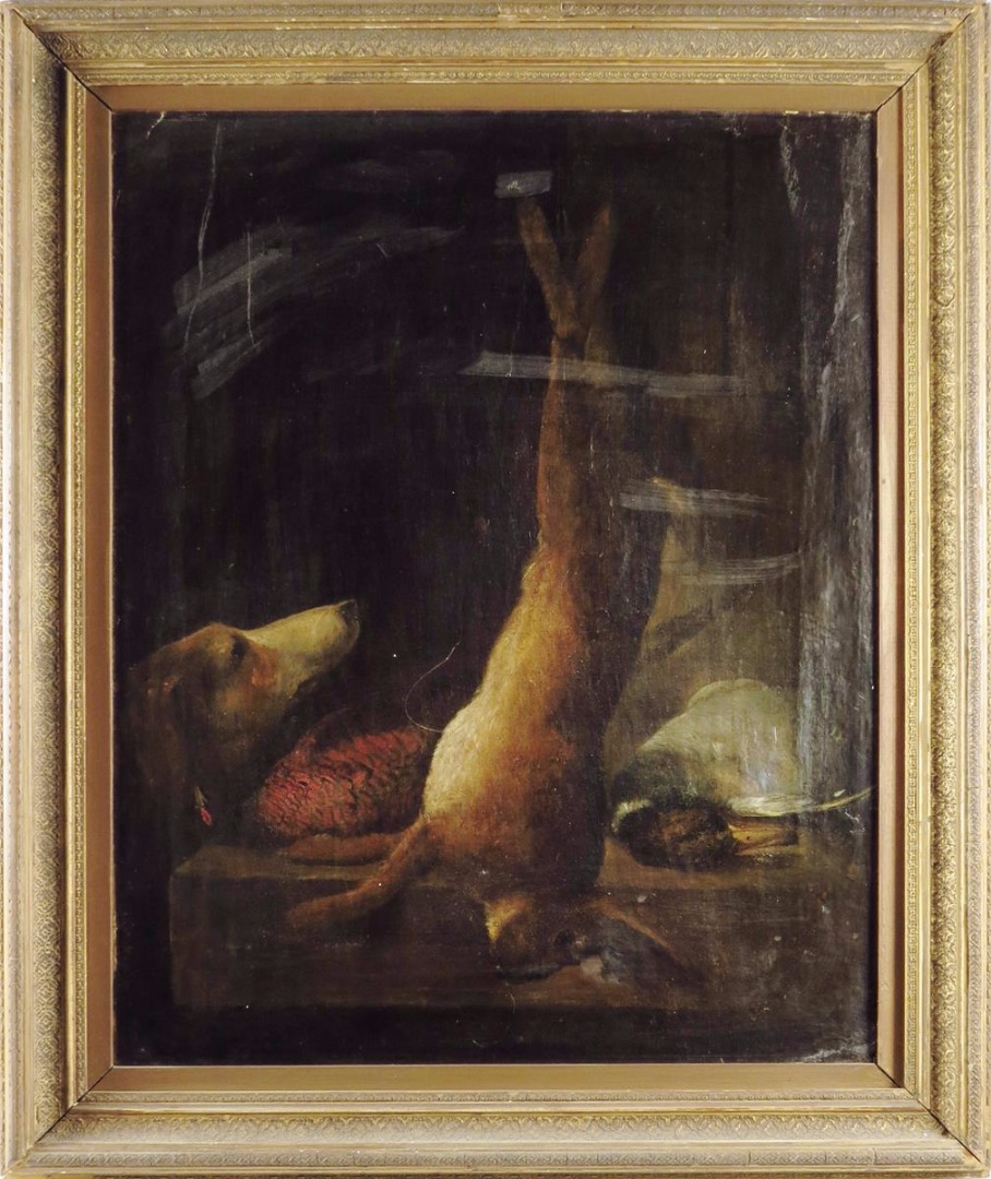 English Naive School (19th century). An oil on canvas painting of a dog with game birds and a hare