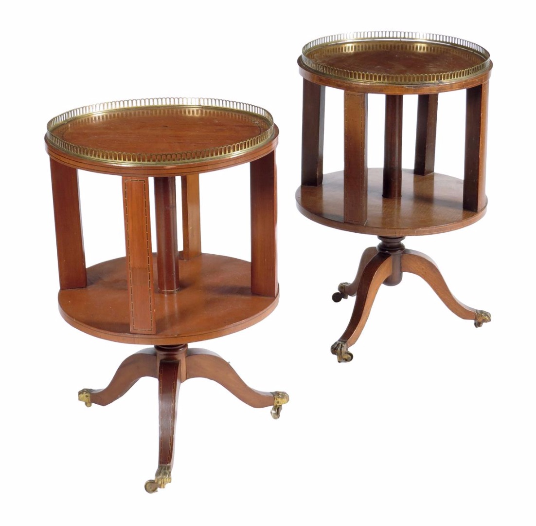 Two Edwardian revolving bookstands, one in satinwood, the other in mahogany, each with a brass gallery and inlaid with stringing, 68.8cm high, 45.5cm diameter (max). (2)