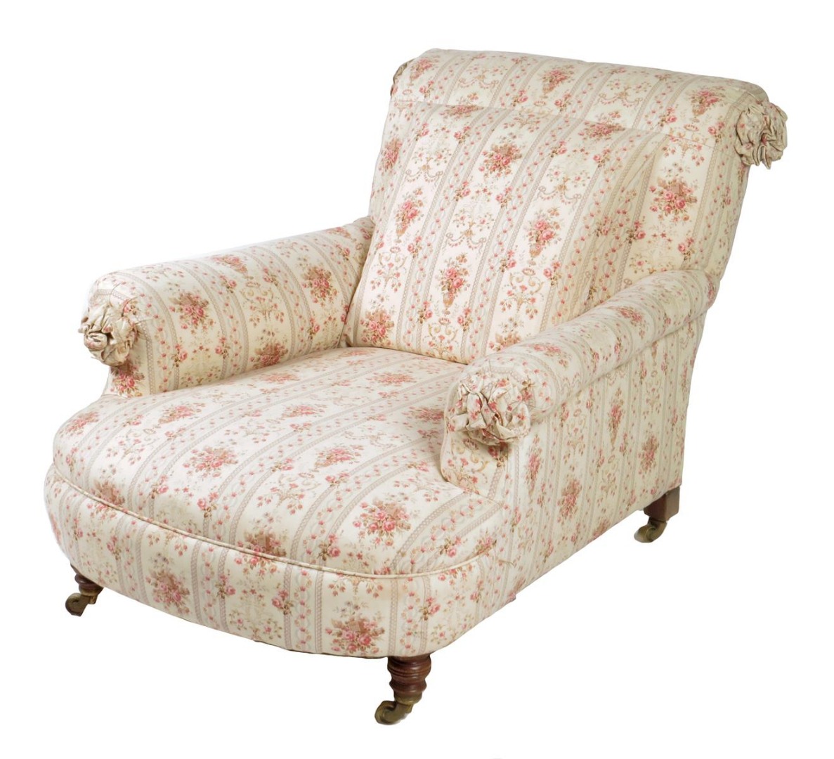 A late Victorian walnut easy armchair by Howard & Sons, upholstered in floral fabric on turned front supports and brass castors, stamped 'HOWARD & SONS LONDON', the inside of the back left leg stamped '11909 7170 HOWARD & SONS LTD BERNERS ST.'.