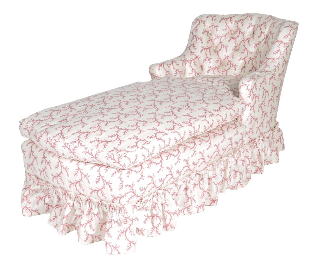 An Edwardian daybed, the button back above a squab cushion, later covered in Ramm fabric on mahogany legs and brass castors, 85cm high, 72cm wide, 176cm long.
