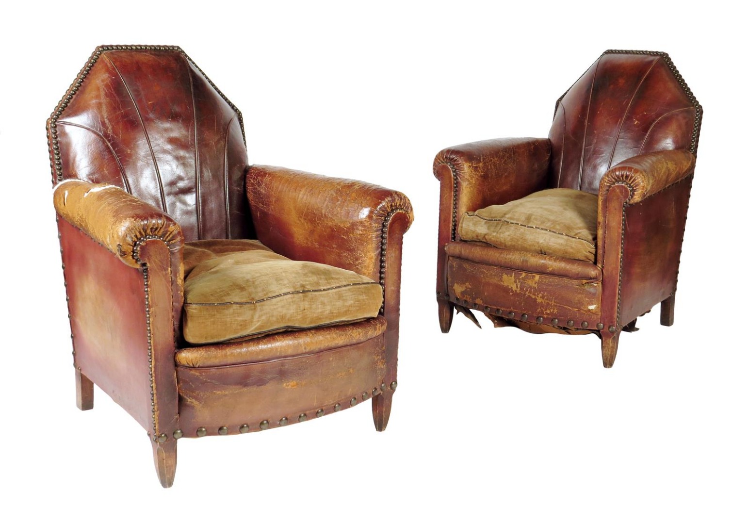 A pair of Art Deco distressed brown leather easy armchairs, each with a fan back with brass studded decoration with a plush covered squab cushion and on faceted beechwood front legs. (2)