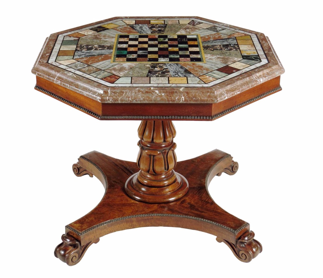 A William IV mahogany and specimen marble centre table in the manner of Gillows, the later octagonal moulded edge top inset with various marbles and semi-precious stones, including: malachite, red griotte, porphyry, verde antico, violet jura brocatelle, cipollin, the centre inlaid with a chequer board, the base with nulled mouldings and with a ribbed baluster and lappet stem, on scroll feet and wooden castors, 73.5cm high, 94cm wide.