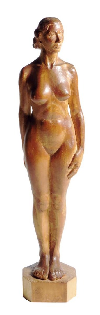‡ Mary Syme Boyd (Scottish 1910-1997). A carved wood figure of a nude lady, standing on an octagonal plinth, signed with initials 'MSB', the underside with a trade card inscribed 'MARY SYME BOYD, HOUSE & STUDIO, 14 BELFORD MEWS, EDINBURGH, 4, SCULPTURE, WOOD CARVER, HAND WROUGHT SILVER', 93.7cm high.