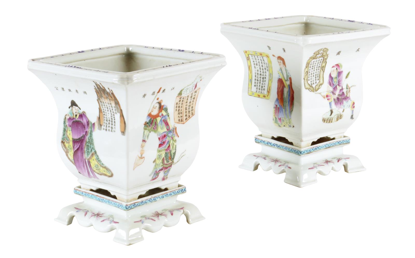 A pair of Chinese porcelain square section jardinieres on stands, each painted in enamels with famous historical figures and with Chinese script, the bases with iron red seal marks, early 20th century, 23.7cm high, 20cm wide. (4)