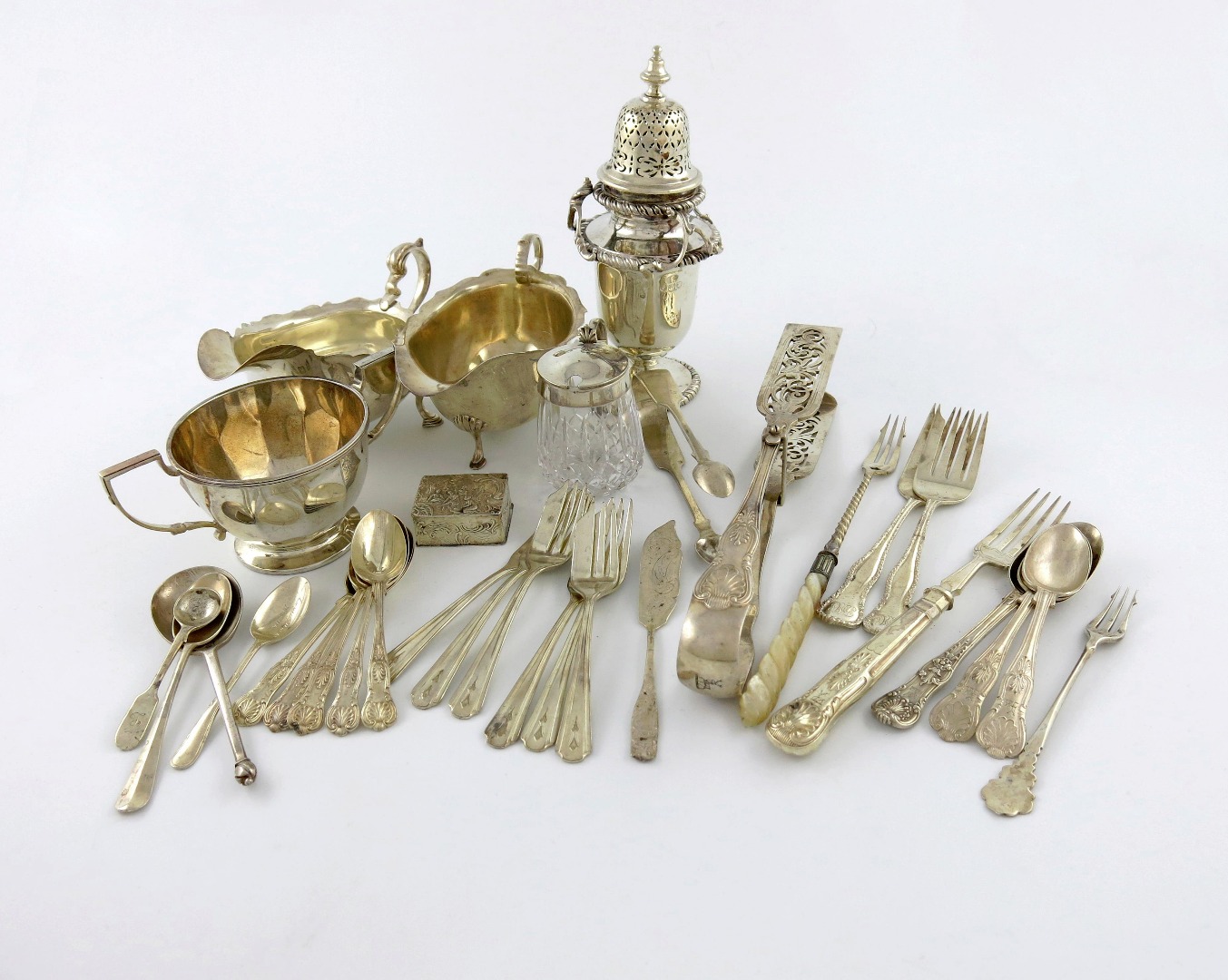 comprising silver items: an Edwardian silver sugar caster, by Charles Townley and John Thomas, London 1909, circular vase form, applied scroll motifs and with gadroon borders, the pull-off cover with a knop finial, on a circular foot, plus two oval sauce boats, a two-handled sugar bowl, a late-Victorian box, a silver-mounted mustard pot, a set of five teaspoons, a pickle fork, four spoons, a butter knife, a pair of sugar tongs and a pair of American forks, plus items of electroplated flatware including a pair of serving tongs, approx. weighable 38oz. (qty)
