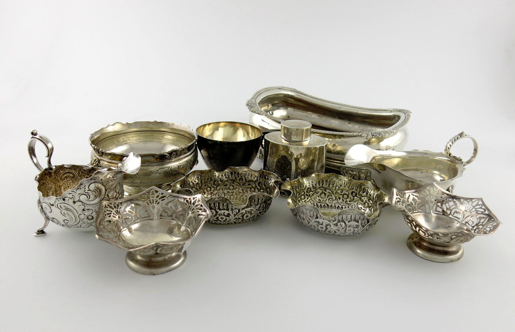 comprising: a George III cruet stand base, London 1819, a two handled bowl, a mug, a tea caddy embossed with a figural scene, two sauce boats, a pair of bonbon dishes and a pair of Indian dishes, approx. weighable 28oz. (qty)