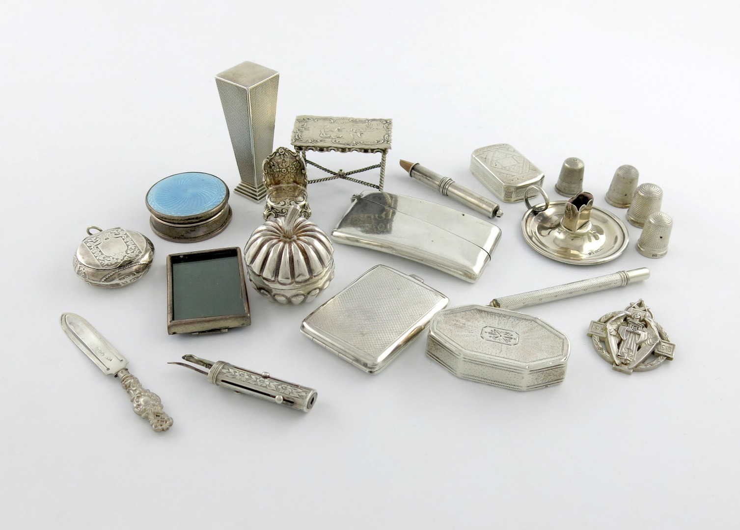 comprising: a desk seal of tapering square form, engine-turned decoration, London 1929, two Georgian snuff boxes, a silver and enamel box, a card case, a match box cover, a miniature frame, a miniature table and chair, a sealing wax holder, four thimbles, a page marker, a compact, a medallion, a retractable pencil/toothpick/button hook, plus a pencil, a case and a metal ware box, approx. weighable 9.5oz. (qty)