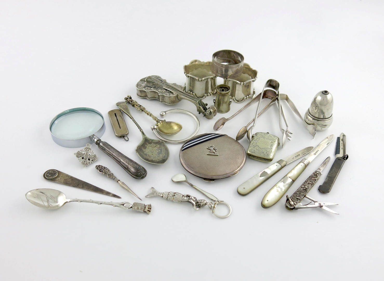 A mixed lot of silver items, comprising: a folding penknife/razor, a pair of napkin rings, a magnifying glass, a compact, a continental metalware miniature cello, two fruit knives, an acorn salt pot, plus other items including electroplated pieces. (qty)