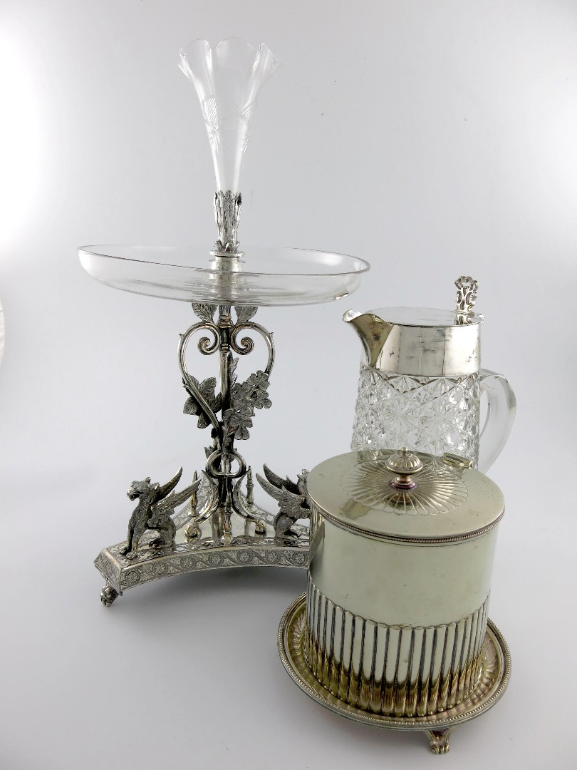 comprising: a Victorian epergne, with a central bowl and trumpet vase, on a triangular base mounted with three griffins, a late-Victorian electroplated mounted lemonade jug, of tapering circular from, hob-nail cut decoration, plain mounts, plus a biscuit box of circular fluted form. (3)