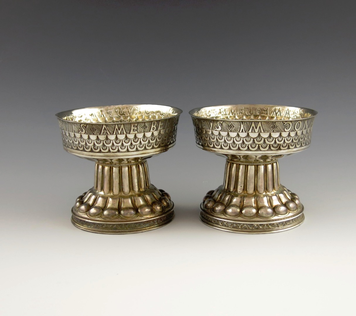 circular bowl with chased decoration and an inscription, on raised circular and fluted bases, with traces of gilding, height 10.2cm, approx. weight 21oz. (2)