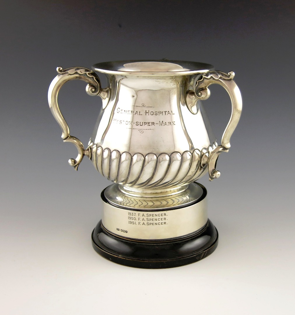 baluster form, part-fluted decoration, leaf capped scroll handles, on a circular foot, inscribed 'The Picton Davies Challenge Cup', 'General Hospital Weston-Super-Mare' 'Nurses Sports Club', on a later plinth with engraved names, height off plinth 15cm, approx. weight 23oz. (2)