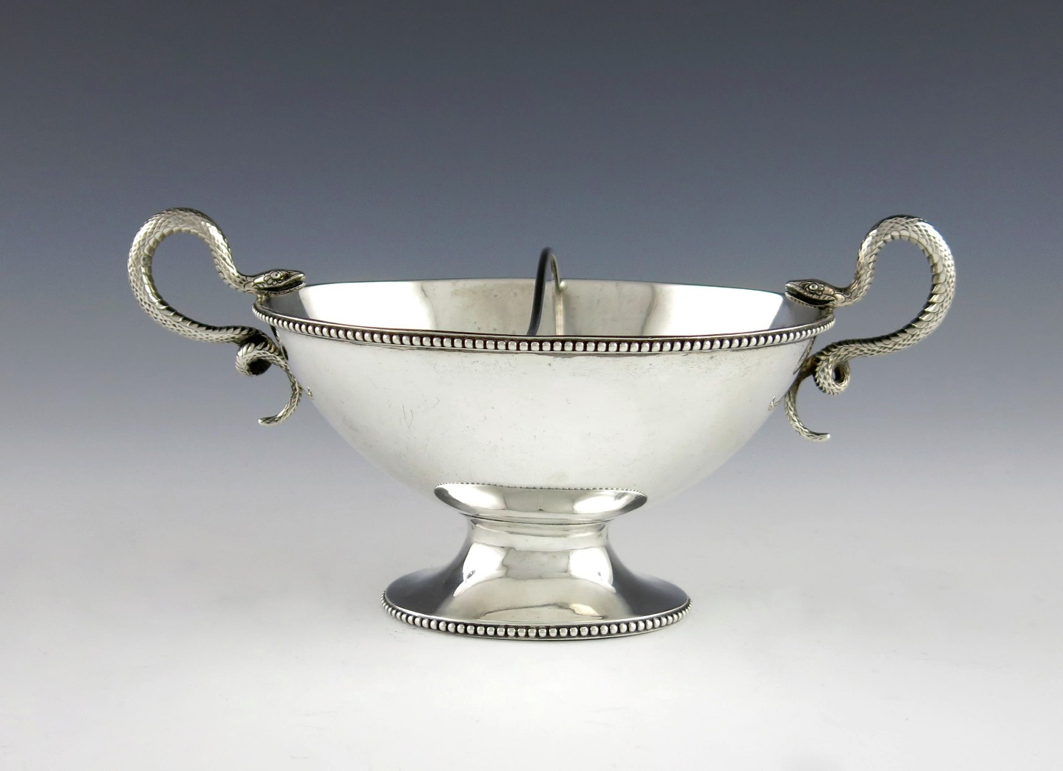 oval form, beaded borders, snake scroll handles, the bowl with a divider, on a raised oval foot, length handle to handle 20.5cm, approx. weight 8.5oz.
